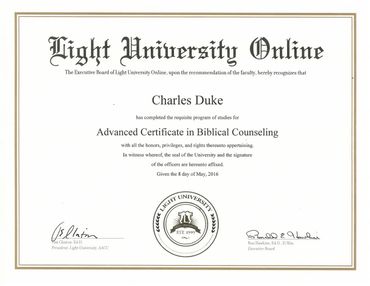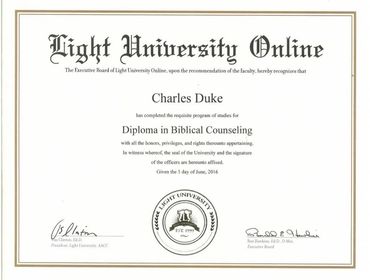 I have a Bachelor's Degree in Counseling Psychology, a Master's Diploma in Biblical Counseling, and Certifications in "Life Recovery" and "Recovery Alive". My approach is both biblical and experiential based on over four decades of experience in recovery through an "anonymous" fellowship.